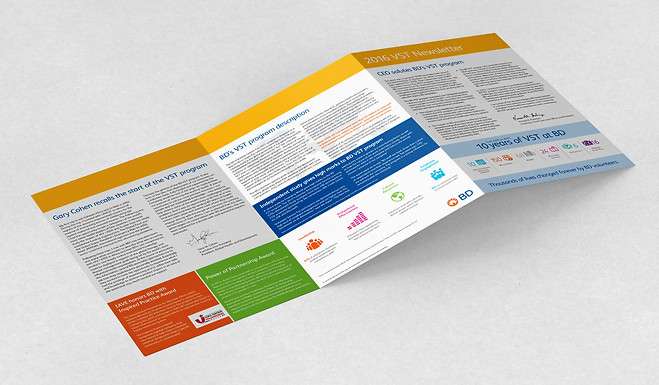 For the ten year anniversary of the Volunteer Service Trip that BD holds, a newsletter was created highlighting all of the achievements in different third-world countries. All of the programs in these countries were started with BD employees with BD products. The newsletter incorporates the new brand standard colors before a solid set of collateral standards were put into place. This was distributed throughout the company (about 1,000 copies).